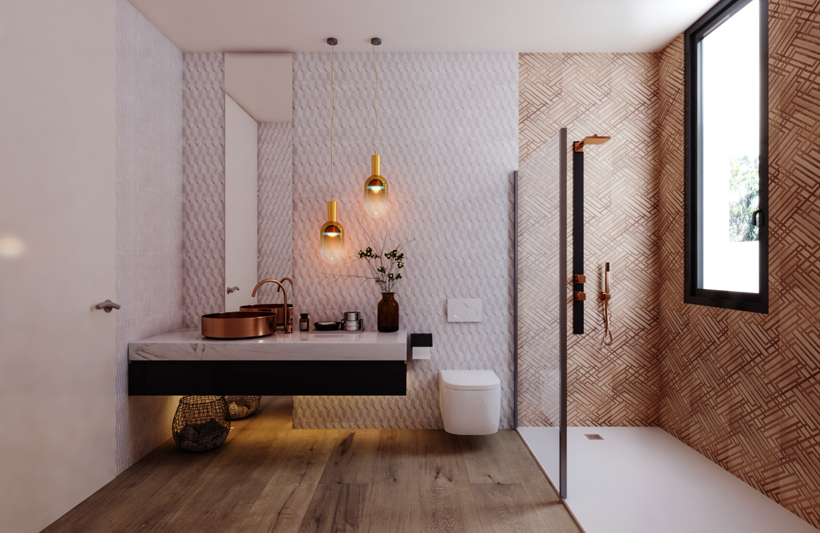 VLOEREN Grijze porseleinen steengoedvloeren of andere grootformaatkleuren, 90×90 cm of vergelijkbaar, gelegd op zelfnivellerende mortel, door het hele huis. Badkamerwanden met porseleinen steengoed in verschillende formaten en kleuren.
