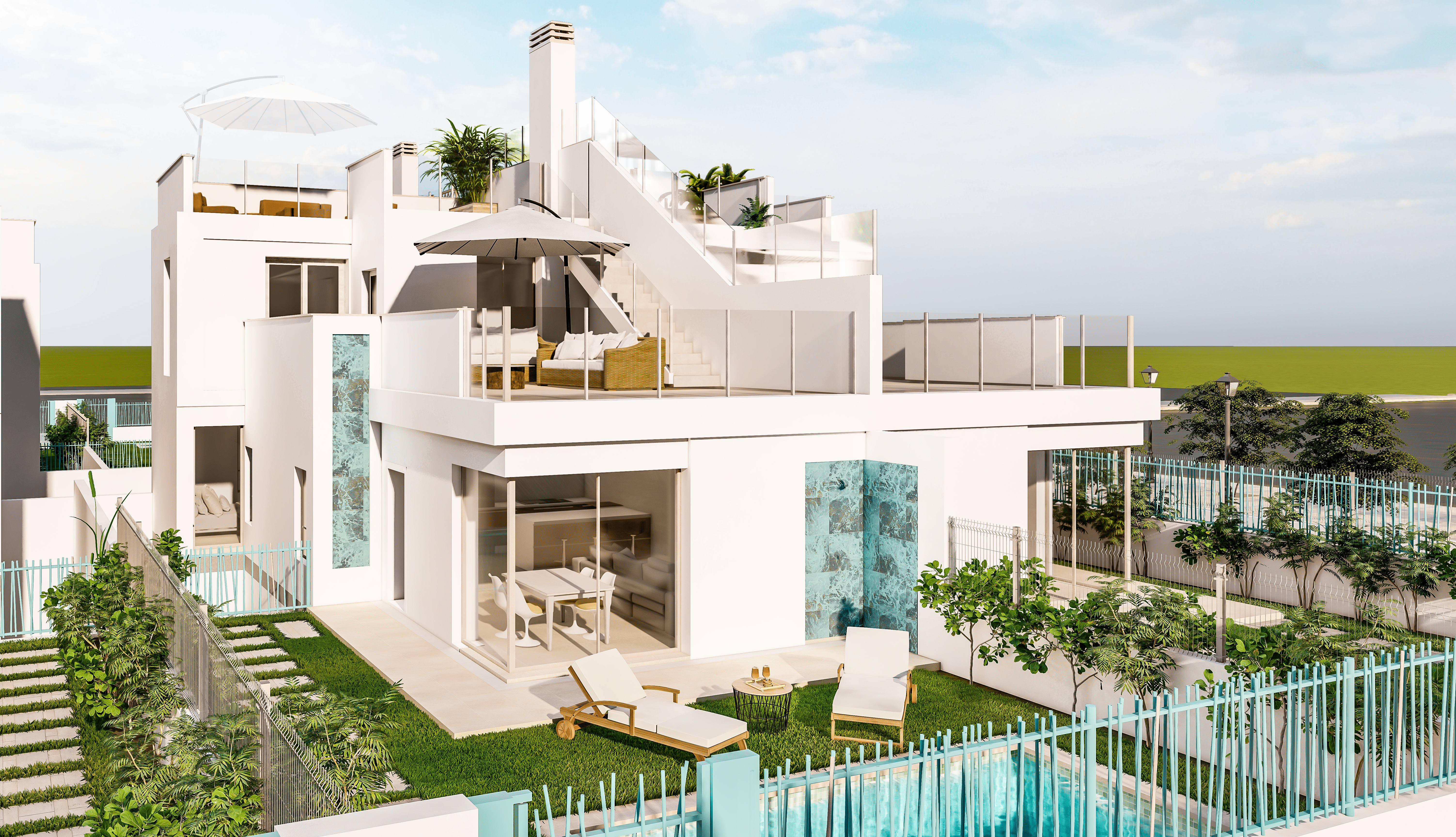 Dit exclusieve wooncomplex bestaat uit moderne, vrijstaande woningen met 3 slaapkamers en 3 badkamers, verdeeld over twee verdiepingen plus een solarium en kelder/garage, beschikbaar als halfvrijstaande en vrijstaande woningen. Alle woningen hebben een open woonplan op de begane grond, waar de woonkamer, eetkamer en keuken in één ruimte zijn geïntegreerd, met grote ramen die uitkomen op een ruim terras en zwembad. Op deze verdieping bevinden zich ook twee tweepersoonsslaapkamers en twee badkamers (waarvan één en suite).
